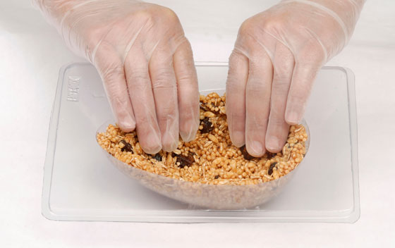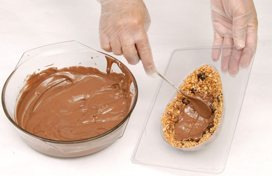 Em uma fôrma de ovo de páscoa nº15, cobrir toda a base da fôrma com a barra de cereais já derretida.
